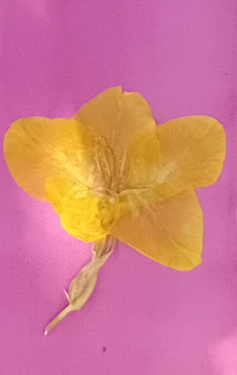 papier akwarelowy, kwiaty nasturcji - zdjęcie (negatyw) na folii, roztwór kurkumy i alkoholu, naświetlanie żarówką z promieniami UV kilka dni, detal