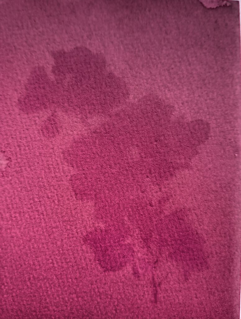 papier akwarelowy, kompozycja z kwiatów i liści, sok z buraka, naświetlanie promieniami słonecznymi kilka dni, detal.