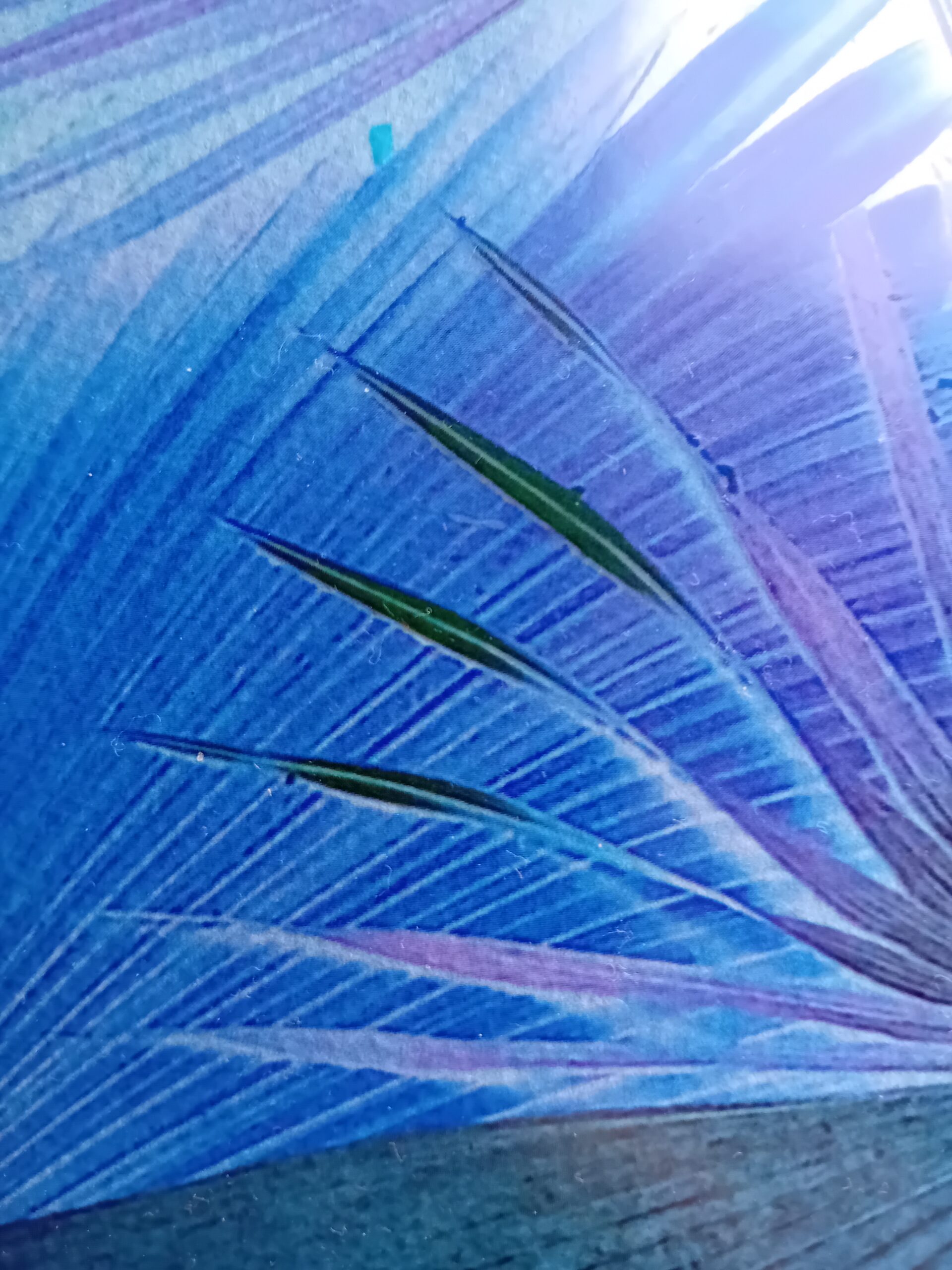 papier akwarelowy, liście palm feniksów kanaryjskich - zdjęcie na folii, roztwór herbaty z klitorii ternateńskiej, naświetlanie żarówką z promieniami UV kilka dni, detal.