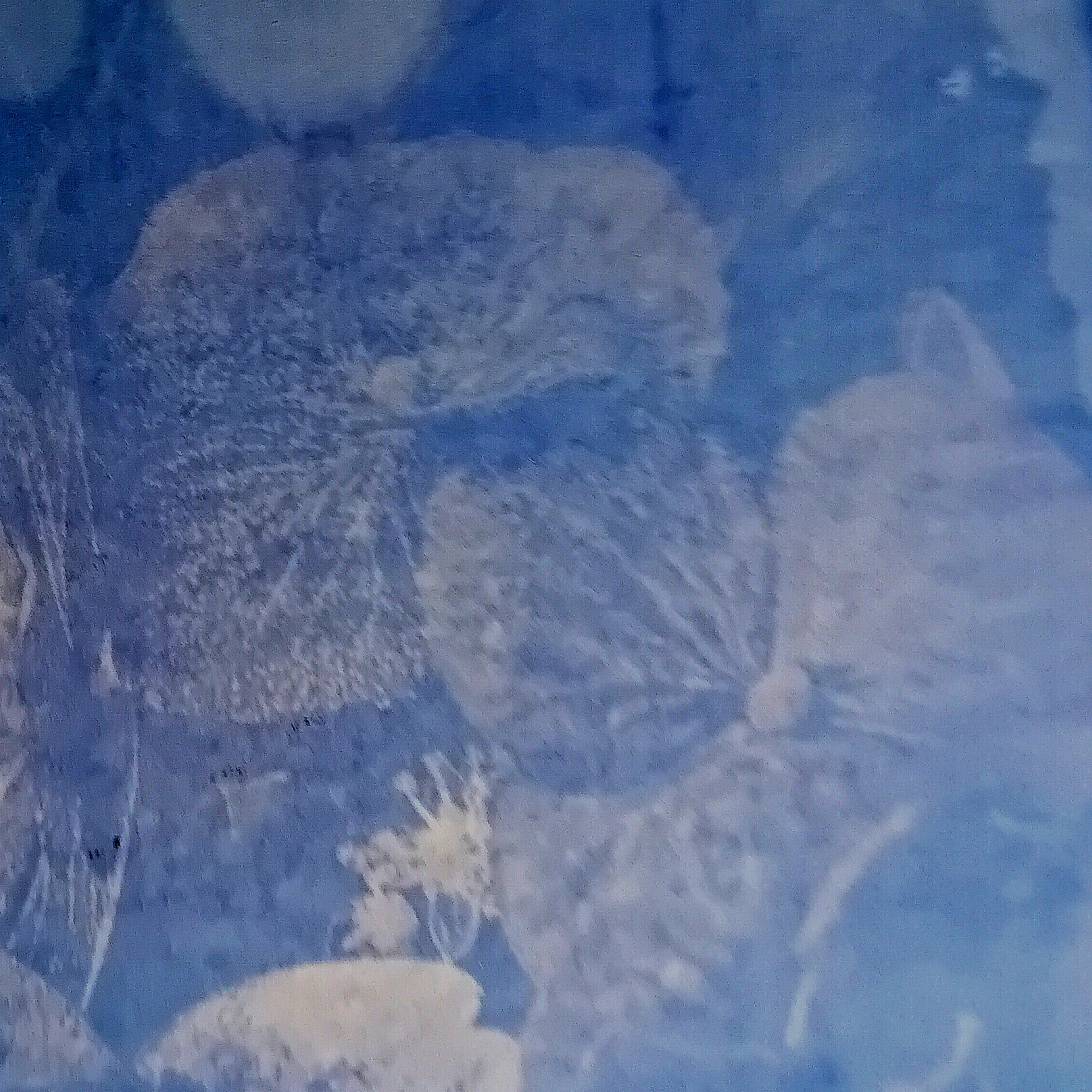papier akwarelowy, kwitnące hortensje - zdjęcie na folii, roztwór herbaty z klitorii ternateńskiej, naświetlanie żarówką z promieniami UV kilka dni, detal.