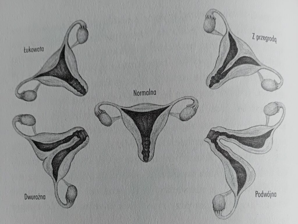 Rycina przedstawia współczesne macice u człowieka. Każda z najczęstszych nieprawidłowości jest powiązana prawdopodobnie z nowszą historią naszej ssaczej ewolucji. Ponadto jedna na 4,5 tys. dziewczynek rodzi się bez macicy. (Ryc. ze s. 124).
