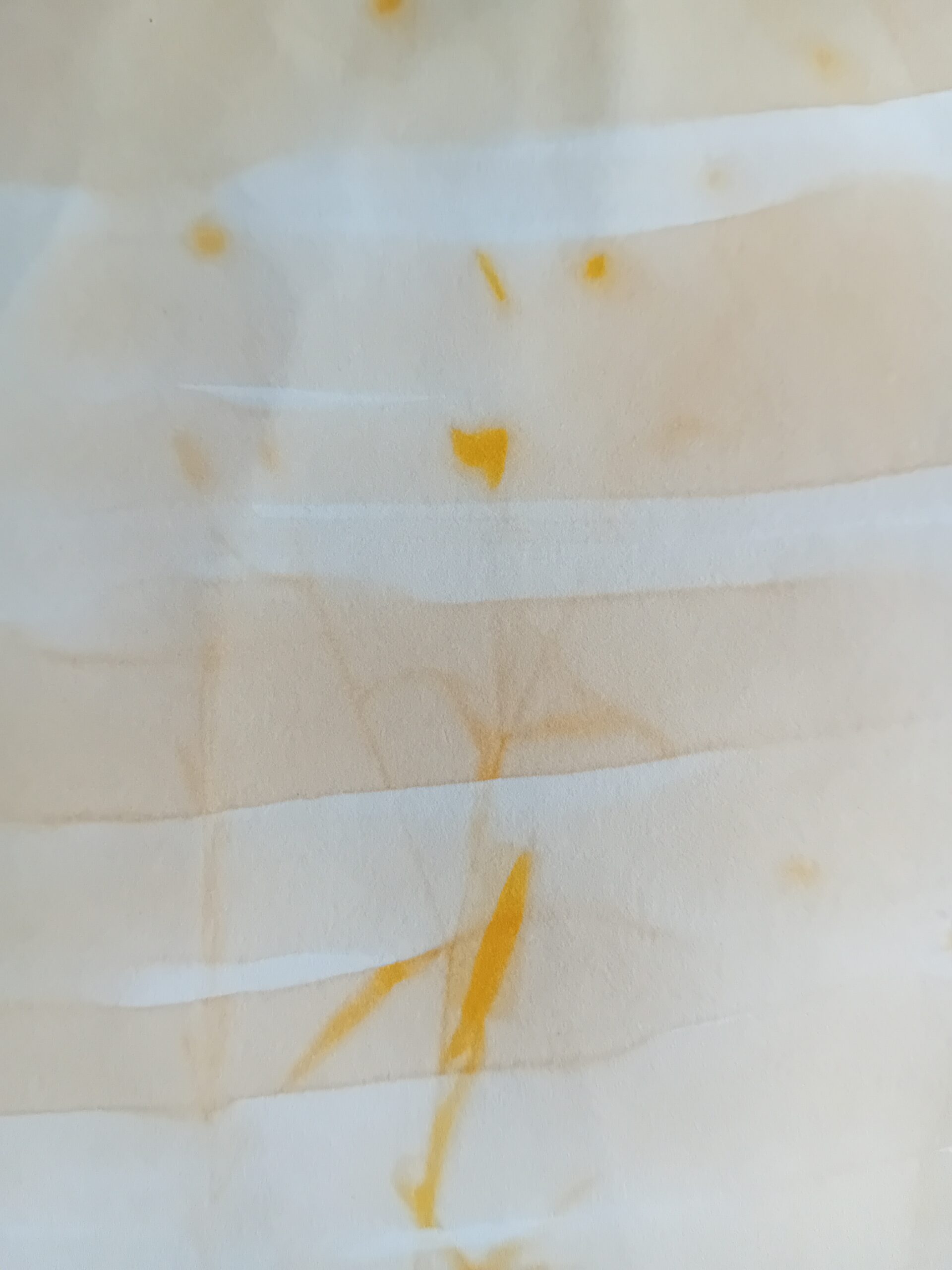 papier akwarelowy, liście bodziszka drobnego, roztwór kurkumy i alkoholu, naświetlanie promieniami słonecznymi kilka dni, detal.