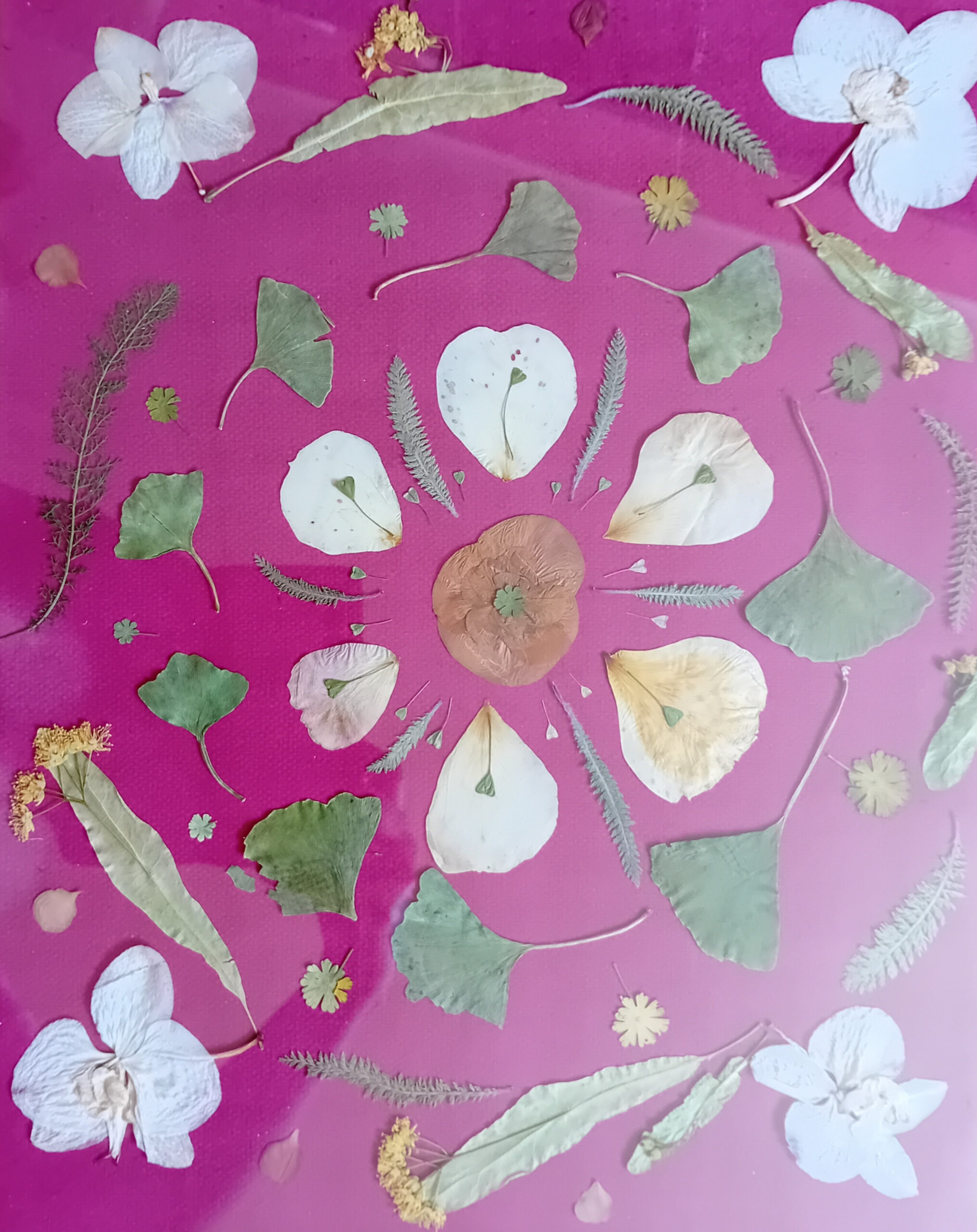 papier akwarelowy, kompozycja kwiatów i liści, sok z buraka, naświetlanie promieniami słonecznymi kilka dni, detal